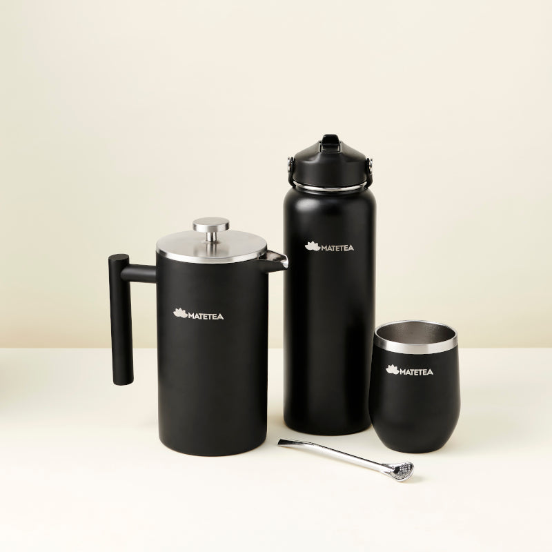 Presskanna: mate-bladen (20g per 500 ml vatten) hälls i presskannan och varmt vatten ovanpå dem. Låt dra i 7-9 minuter och tryck sedan ner pressen.